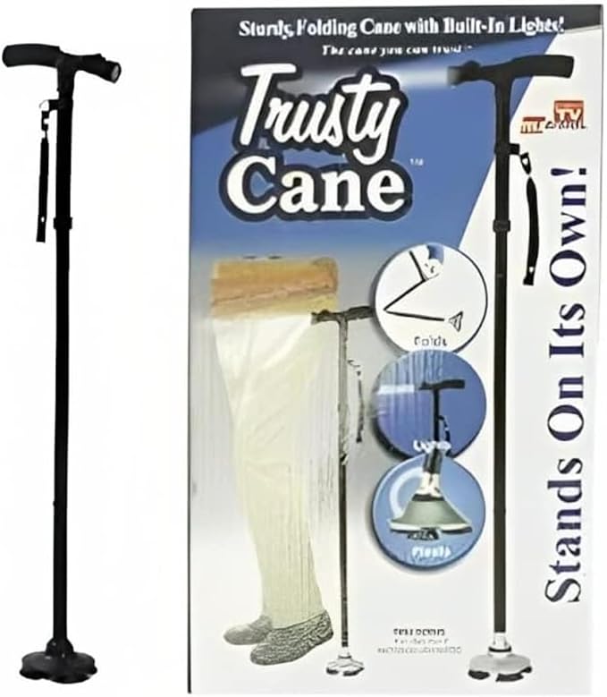 العصا السحرية Trusty Cane هي عصا ذكية قابلة للطي مزودة بضوء أمامي لتوفير رؤية واضحة أثناء المشي ليلاً، وتتميز بقاعدة مرنة ثلاثية تمنحها ثباتاً عالياً يجعلها تقف بمفردها دون دعم. مناسبة لكبار السن أو لمن يحتاجون توازناً إضافياً أثناء المشي.